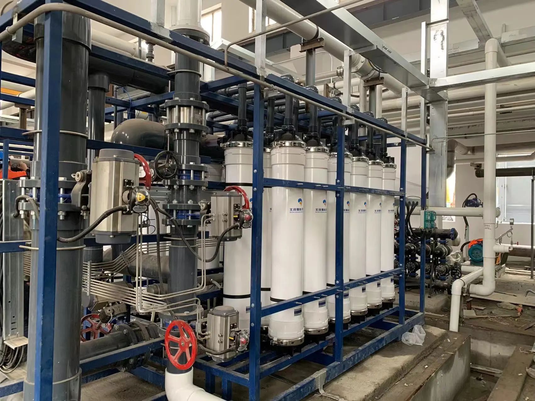 北排装备公司采用自主研发的UF-1020ET型压力式超滤膜组件,单支膜面积120平方米,为目前国内单支最大膜面积压力式超滤膜组件,其核心膜过滤材料(膜丝)使用TIPS(热致相分离法)工艺制造。经过2019年至今的多次迭代升级,该产品性能不断完善,具有膜孔径均一、出水水质稳定优势特性和高耐酸、高耐碱、高耐氧化特点,能够满足项目超滤处理工艺段高效运行和出水稳定达标的需求,为汽车工业废水处理提供了高效解决方案,为我国环保设备行业开拓欧洲市场提供宝贵范例。