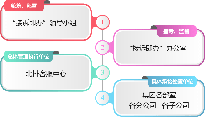成立以集团党委书记和总经理为组长,党委委员、经理班子成员为副组长、各业务部室主要负责人、各分子公司党政负责人为成员的“接诉即办”领导小组。逐步形成了以“1个热线中心”为中枢,全面网联各业务部室、各分子公司的“1+N+N”工作模式、全方位综合服务体系和快速响应的拓扑网状系统平台。
